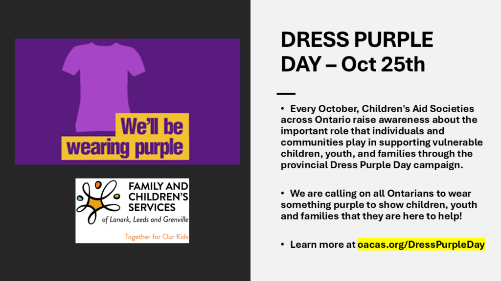 Every October, Children’s Aid Societies across Ontario raise awareness about the important role that individuals and communities play in supporting vulnerable children, youth, and families through the provincial Dress Purple Day campaign. We are calling on all Ontarians to wear something purple to show children, youth and families that they are here to help! Learn […]