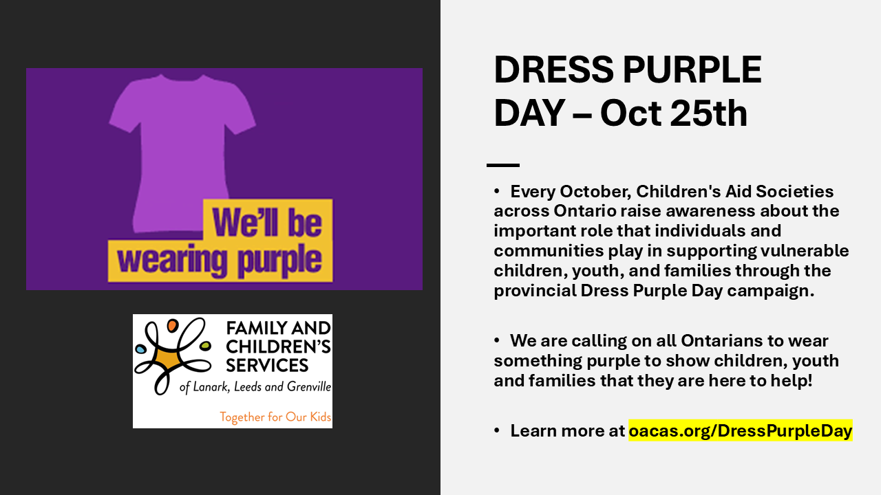 Every October, Children’s Aid Societies across Ontario raise awareness about the important role that individuals and communities play in supporting vulnerable children, youth, and families through the provincial Dress Purple Day campaign.