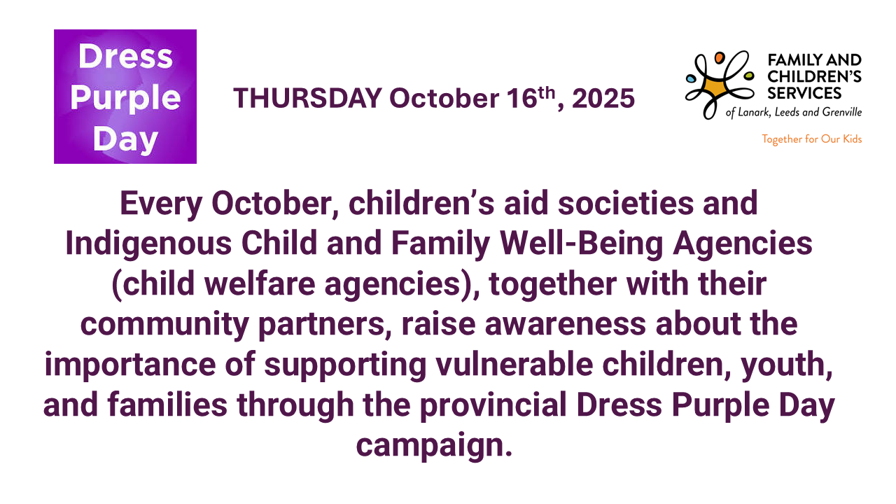 Every October, Children’s Aid Societies and Indigenous Children and Family Well-Being Agencies (child welfare agencies), together with their community partners, raise awareness about the importance of supporting vulnerable children, youth and families through the provincial Dress Purple Day campaign.